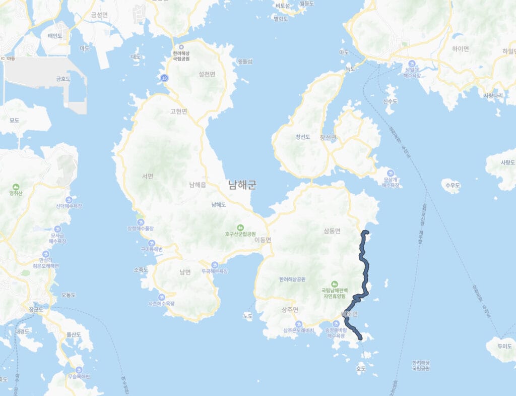 남해도는 남해대교를 건너면 만나는 설천면부터 나비 형태를 지닌 섬을 보고, 즐기고, 누린 후에 사천으로 빠지는 삼천포대교 코스를 추천합니다. 100km가 넘는 남해군 일주 도로를 꼼꼼히 다니며 바다와 산과 숲의 명소들을 즐기기에는 한달살기에도 부족함이 있지만, 오늘은 그 중에서도 남해를 대표하는 물미해안도로 드라이브 코스를 추천합니다.