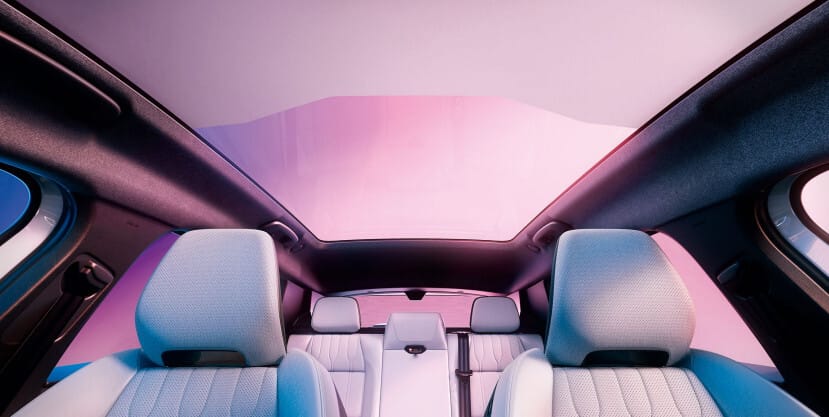 2열 무릎 공간 278mm, 머리 위 공간 884mm, 평평한 바닥 설계로 성인 5명이 넉넉하게 탑승할 수 있습니다. 글라스 루프(솔라베이 파노라믹 선루프)는 투명도 조절이 가능해 쾌적함을 더합니다.